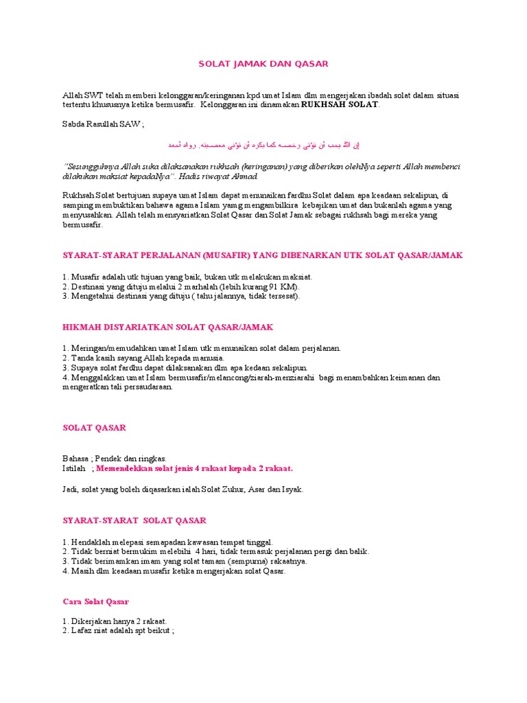 Lafaz niat ketika takbiratul ihram ialah seperti berikut. Waktu selepas subuh itu sebelum matahari naik tidak dibenarkan solat-sola sunat kecuali Solat sunat yang mendatang. Dan apabila kamu musafir di muka bumi maka kamu tidaklah berdosa mengqasarkan memendekkan sembahyang Syarat-Syarat Solat Qasar.